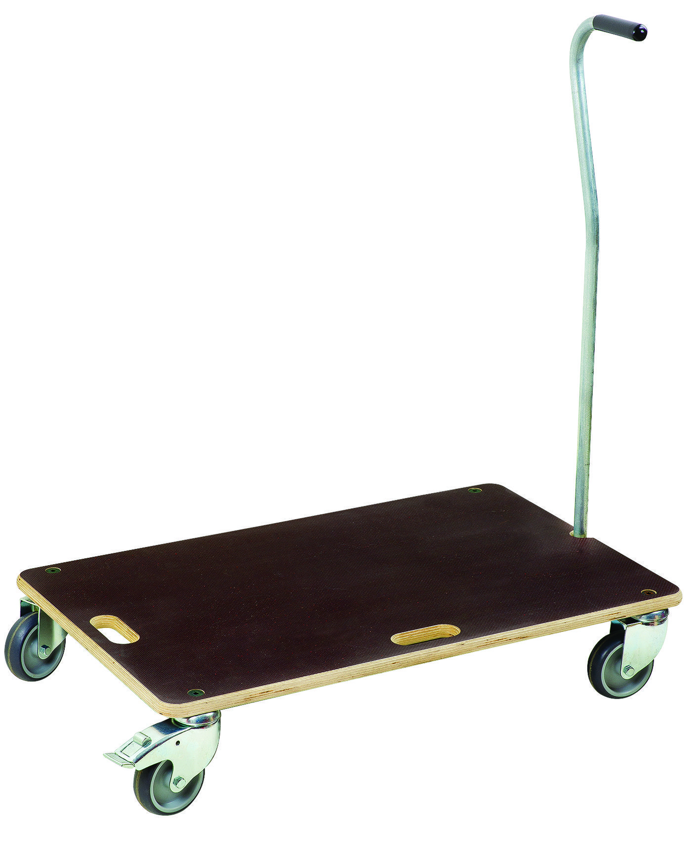 Met 4 wielen Ø 100 mm waarvan 2 geremd.
