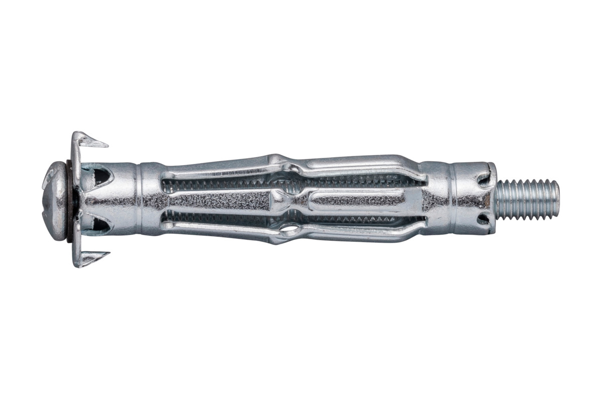Metalen hollewandankers inclusief schroef met viervoudige spreiding voor gelijkmatige verdeling van de belasting, voor bevestigingen op (gips)plaat materialen. Te monteren met hollewand tang #70882. Bevestigingsdikte (= plaat + te bevestigen werkstuk) 3-8mm.