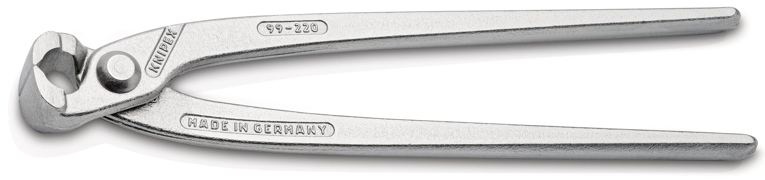 99 04 220 Moniertang Voor het vlechten en knippen van binddraad in één beweging: snel, betrouwbaar en goedkoop. Snijkanten extra gehard, hardheid ca. 61 HRC. – Snijcapaciteiten half harde draad (diameter): Ø 2,4mm – Snijcapaciteiten harde draad (diameter): Ø 1,6mm