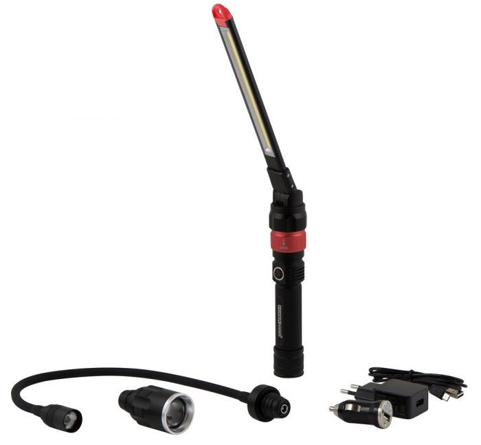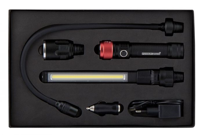 Powerhand 3in1 led lamp met handige snelkoppeling om de verschillende lampen te kunnen wisselen. Inhoud: handgreep met Li-ion accu, extra dunne looplamp, zaklamp en een flexibele inspectielamp in een schuiminleg zodat het set makkelijk op te bergen is in een gereedschapswagen. Incl. 230 V en 12 V lader.