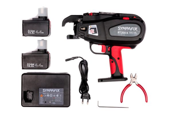 De Sympafix RT200 vlechtmachine wordt standaard geleverd met twee accu’s en een snellader in een robuuste koffer.