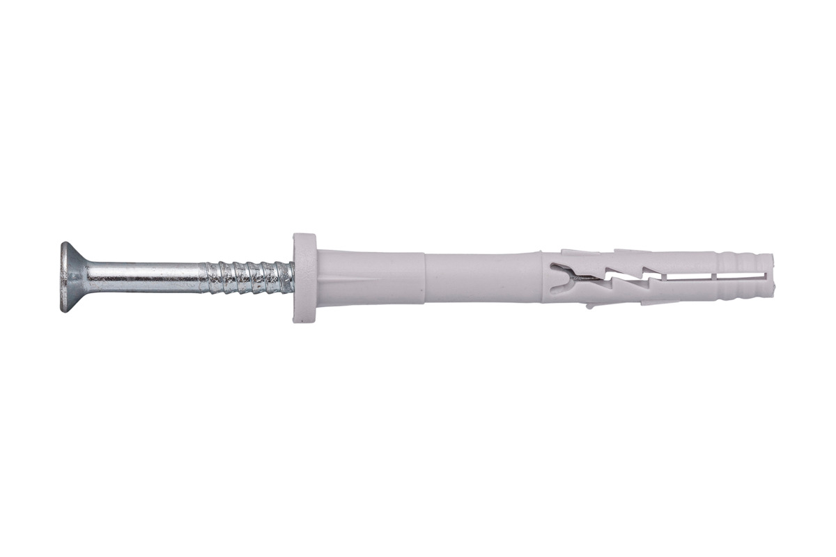 Slagplug met voorgemonteerde schroef en verzonken kop, voor o.a. bevestigen van hout op beton. De plug is vervaardigd van kwalitatief hoogwaardig (virgin) nylon, de schroefnagel van gegalvaniseerd staal. Bij het inslaan van de nagelplug spreidt de nylon plug open en verankert zich in de ondergrond.