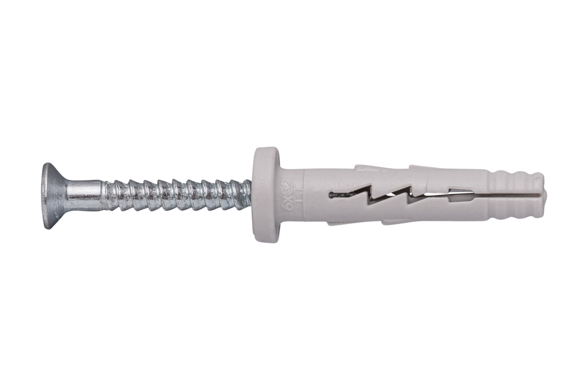 Slagplug met voorgemonteerde schroef en verzonken kop, voor o.a. bevestigen van hout op beton. De plug is vervaardigd van kwalitatief hoogwaardig (virgin) nylon, de schroefnagel van gegalvaniseerd staal. Bij het inslaan van de nagelplug spreidt de nylon plug open en verankert zich in de ondergrond.