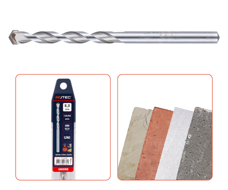UNIDre – Multifunctionele boor met speciaal diamantgeslepen hardmetalen boorpunt. Alleen voor draaiende toepassing, niet kloppend. Ideaal voor accu-gereedschap, tot 40% meer boorgaten per accu-lading. Alle boren boven ø13 zijn standaard afgedraaid naar schacht ø13.